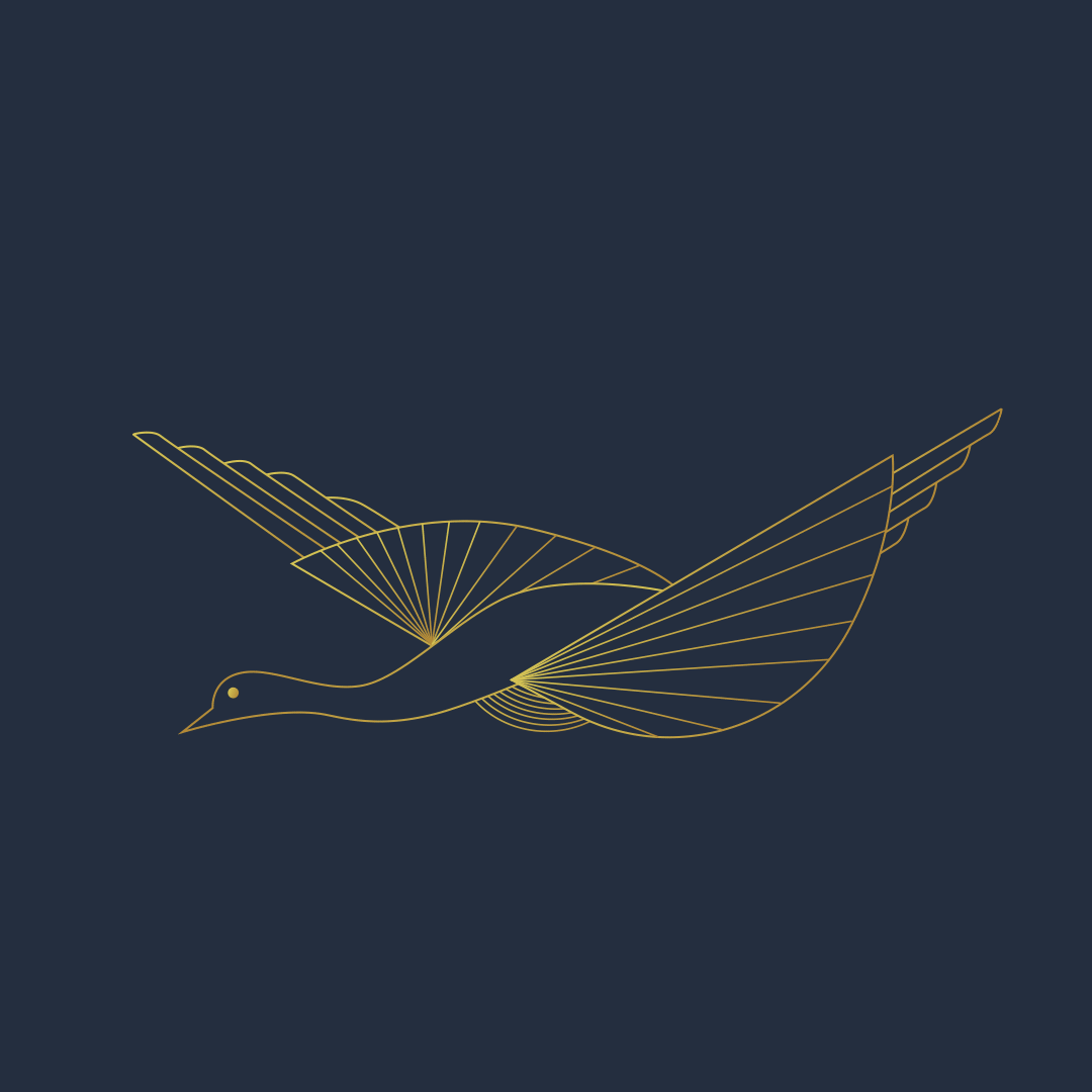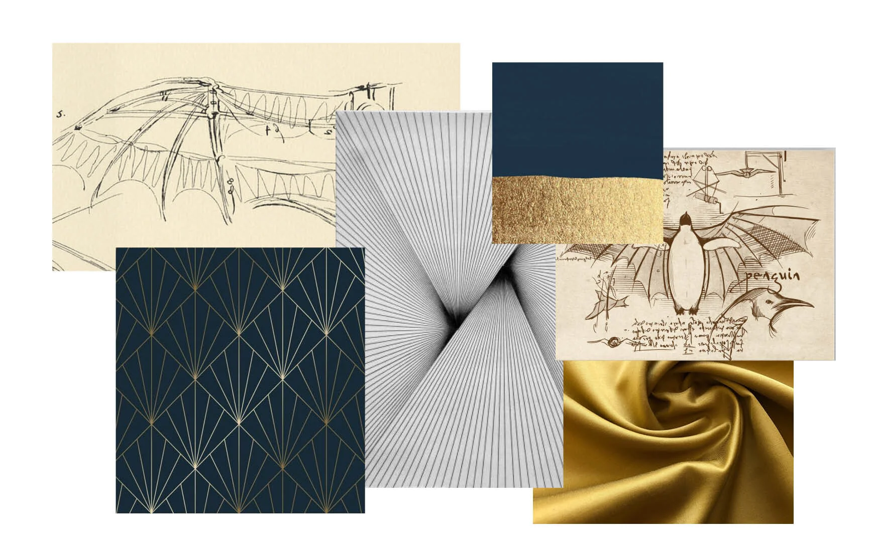 Crane, swallowtail butterfly and a mockingbird are three visuals created using repeated outlines. Each visual is associated with a story about aviation history or with a scent.